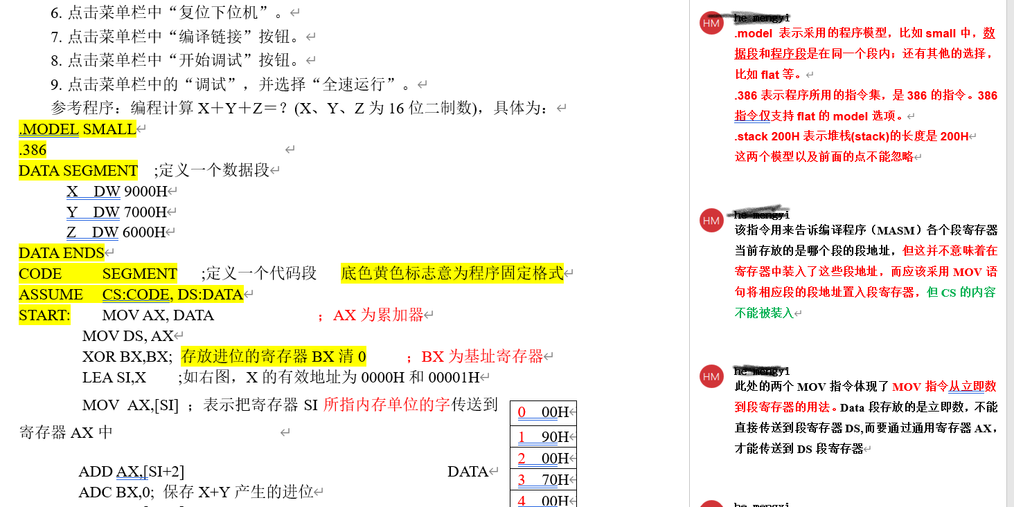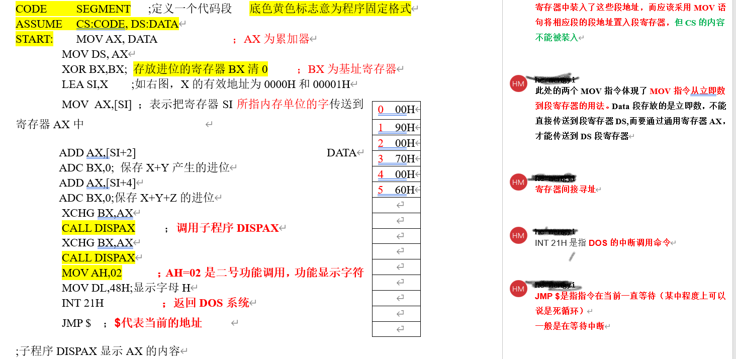该实验的关键是32位二进制数的相加方法以及32位结果数的显示。该程序调用了多个子程序,比较复杂,需要我们逐步分析一个个模块。初学微机不久,对汇编程序尚不熟练,以下是对类似程序16位二进制数相加程序一些重要指令的标注。