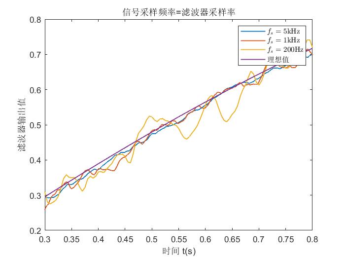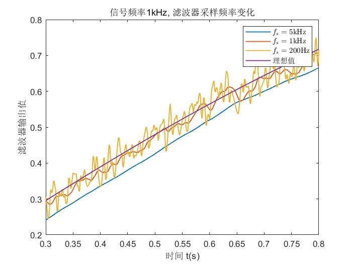 legend('$f_s = 5rm{kHz}$', '$f_s = 1rm{kHz}$','$f_s = 200rm{Hz}$', '理想值', 'Interpreter', 'latex');