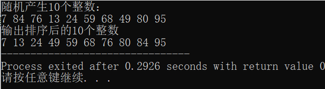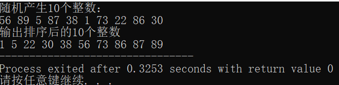 #include<stdio.h> #include<stdlib.h> #include<time.h> void sort1(int s[],int n) { int i,j,k; int temp; for(i=0;i<n-1;i++) for(j=9;j>=i+1;j--) if(s[j]<s[j-1]) { temp=s[j]; s[j]=s[j-1]; s[j-1]=temp; } } main() { int i,a[10]; srand((unsigned int)time(NULL)); printf("随机产生10个整数:n"); for(i=0;i<10;i++) a[i] =rand()%100; for(i=0;i<10;i++) printf("%d ",a[i]); printf("n"); sort1(a,10); printf("输出排序后的10个整数n"); for(i=0;i<10;i++) printf("%d ",a[i]); }