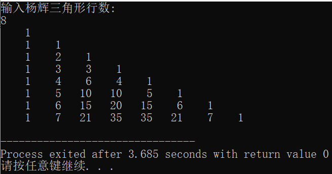 #include<stdio.h> main() { int a[50][50],i,j,n; printf("输入杨辉三角形行数:n"); scanf("%d",&n); for(i=1;i<=n;i++) { a[i][i]=1; a[i][1]=1; } for(i=3;i<=n;i++) { for(j=2; j<=i-1;j++) a[i][j]=a[i-1][j-1]+a[i-1][j]; } for(i=1;i<=n;i++) { for(j=1;j<=i;j++) printf("%5d",a[i][j]); printf("n"); } }