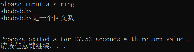 #include<string.h> #define N 40 main() { char str[N],ch='Y'; int i; int len; printf("please input a stringn"); scanf("%s",str); len=strlen(str); for(i=0;i<(len/2);i++)//回文数从左至右和从右至左一致,所以只需判断前一半与后一半对应数是否一致 ,所以i<len/2 { if(str[i]!=str[len-1-i]) { ch='N'; break; } } if(ch=='Y') printf("%s是一个回文数n",str); else printf("%s不是一个回文数n",str); }
