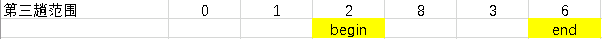 3、第三趟排序,排序范围(2,5),其中的最小值为2,可以发现不用交换,其实是2元素自己交换自己(最小值位置与begin指针所在位置重合)