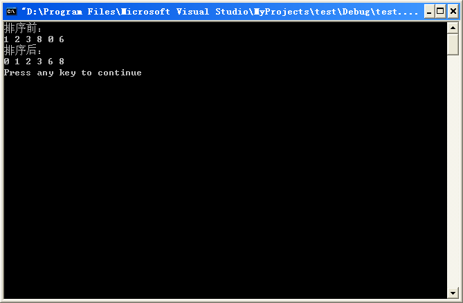 我们可以发现,6个数的数组,进行了5次排序,根据算法执行过程分析,我们可以感觉到,选择排序要有两个模块构成,一个用于寻找待排序范围中的最小值,并进行数据交换;另外一个用于遍历,调用前面说的最小值函数。所以,我们可以得到如下选择排序的程序。