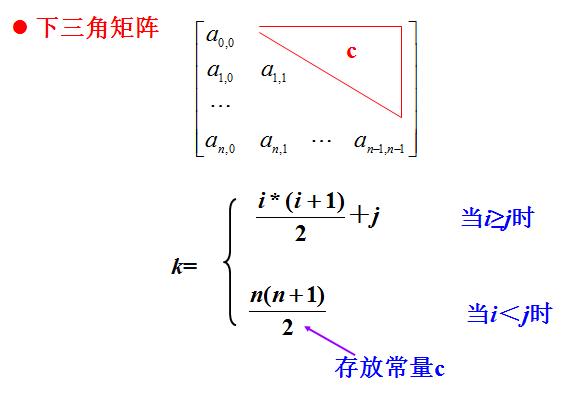 这样,就可以将n2个元素压缩存储到n(n+1)/2个元素的空间中。以行序为主序存储其下三角+对角线的元素。