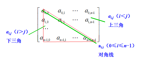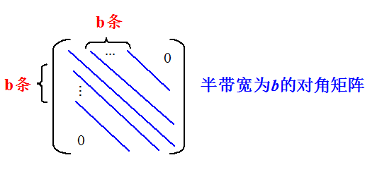 对于半带宽为b(0≤b≤(n-1)/2)的对角矩阵,其|i-j|≤b的元素ai,j不为零,其余元素为零。