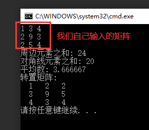 以上就是典雅巨人最近收集整理的关于C语言计算N*N矩阵的转置、平均值、对角线元素之和、周边元素之和的全部内容,更多相关C语言计算N*N矩阵内容请搜索靠谱客的其他文章。