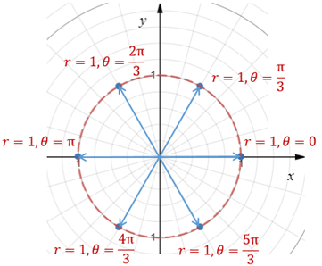 在计算w的乘方的时候,我们需要考虑用极坐标表示复平面。在极坐标下,w表示模长为1的向量从(1,0)开始,绕原点逆时针旋转了2π/n,如此一来,我们就可以知道n等于任意值时w的位置,并且也同样知道w的乘方的位置。对于w来说,wn的模长仍然等于1,只是旋转的角度有所不同。比如n=6时,w=ei2π/6= eiπ/3,w2=(eiπ/3)2= ei2π/3。