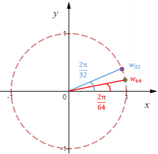 w64和w32的模长相等,w64的幅角是w32的2倍: