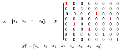 P的效果是使得所乘行向量x中序号为奇数的分量x1,x3,x5……提到前面,偶数序号的分量x2,x3,x6……放到后面。例如: