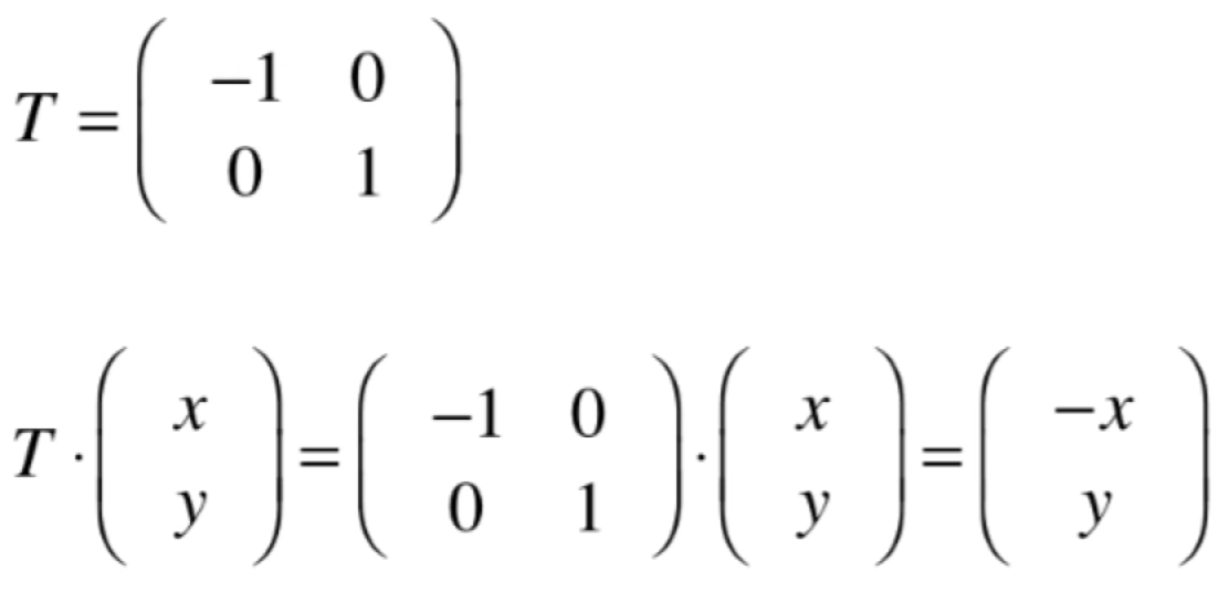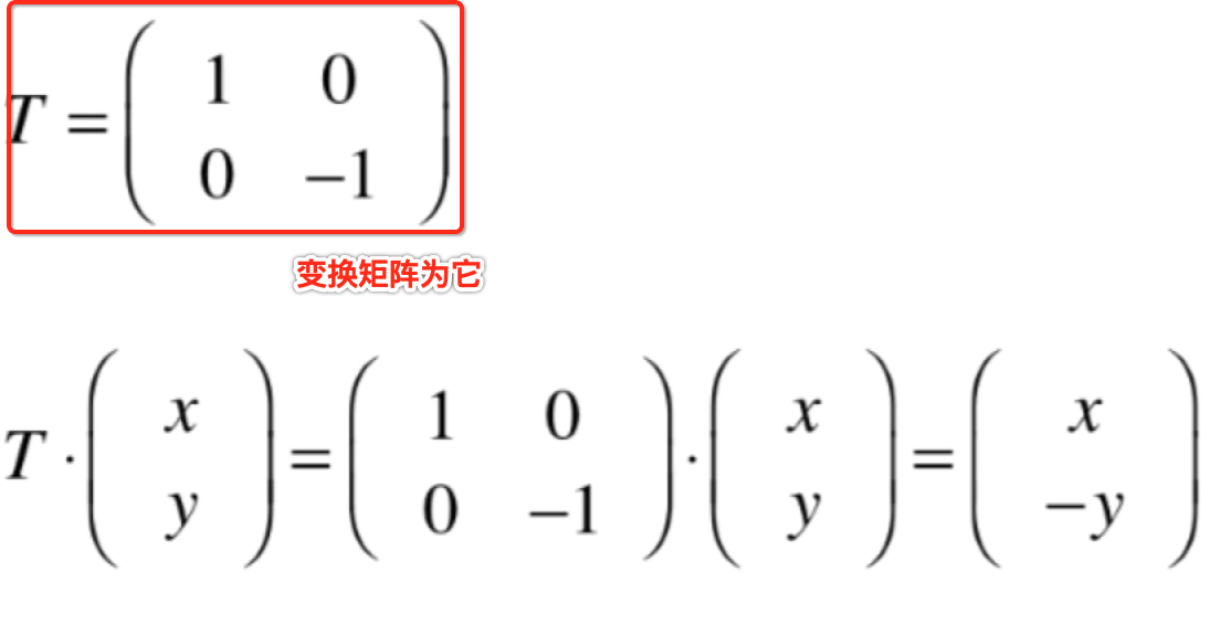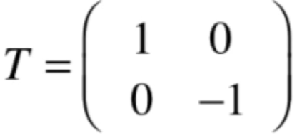 这个变换矩阵其实就是表示(1,0),(0,-1)这样一组基,这个变换就会将这组基下的(x,y)看它在标准基下就是(x,-y),这样就完成了x轴的翻转。所以可以看出对于这个变换矩阵T本质就是对应另外一组基另外一个坐标系,同理再看一个关于y轴翻转的例子:
