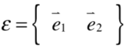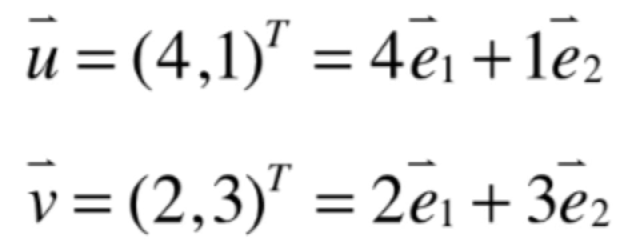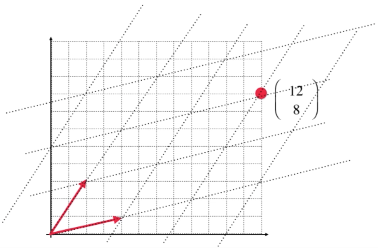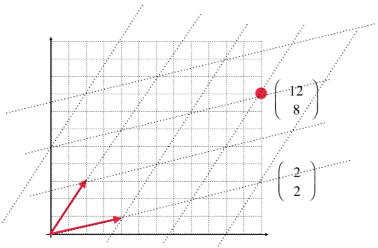 如果定义好了这么一个基的话,可以以这两个基的向量所对应的方向当作二维平面两个轴的方向,而两个向量的模当作是两个方向上的一个单位是多少,这样这组基又定义了这么一个坐标系: