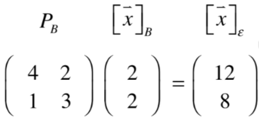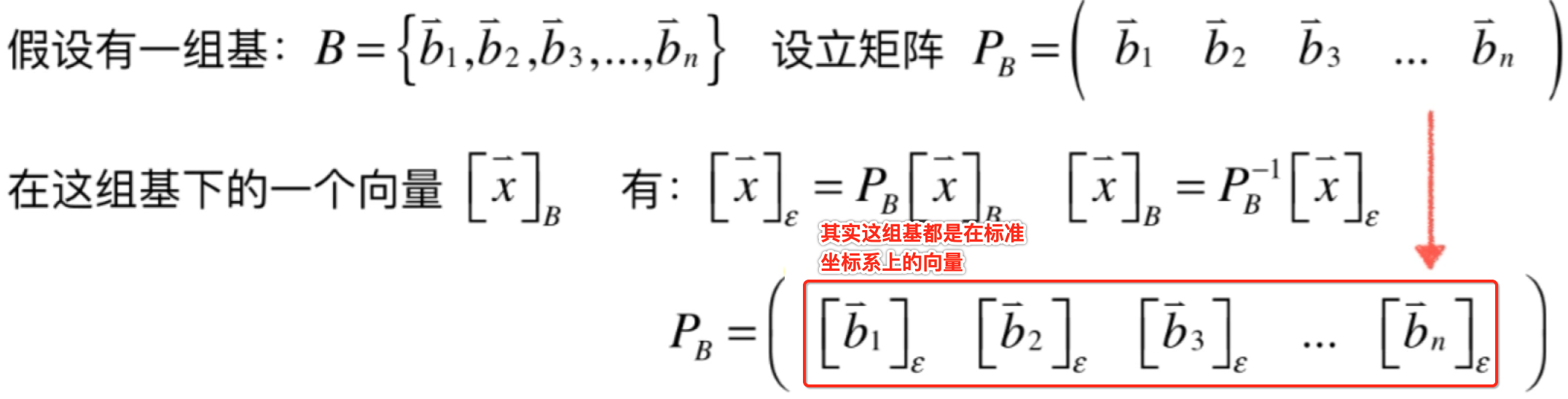 这里千万不要搞混Pb和Pb的逆的使用,Pb所乘的坐标一定是B这组基下所对应的坐标,而如果不是B这组基下所对应的坐标而是标准坐标系所对应的坐标,就应该用Pb的逆矩阵来乘。
