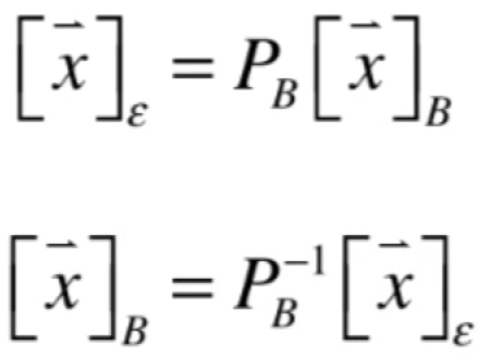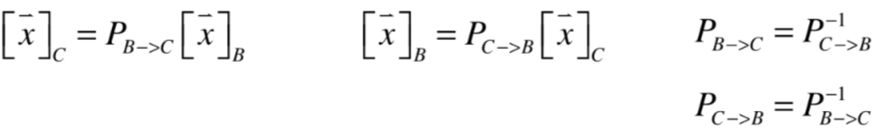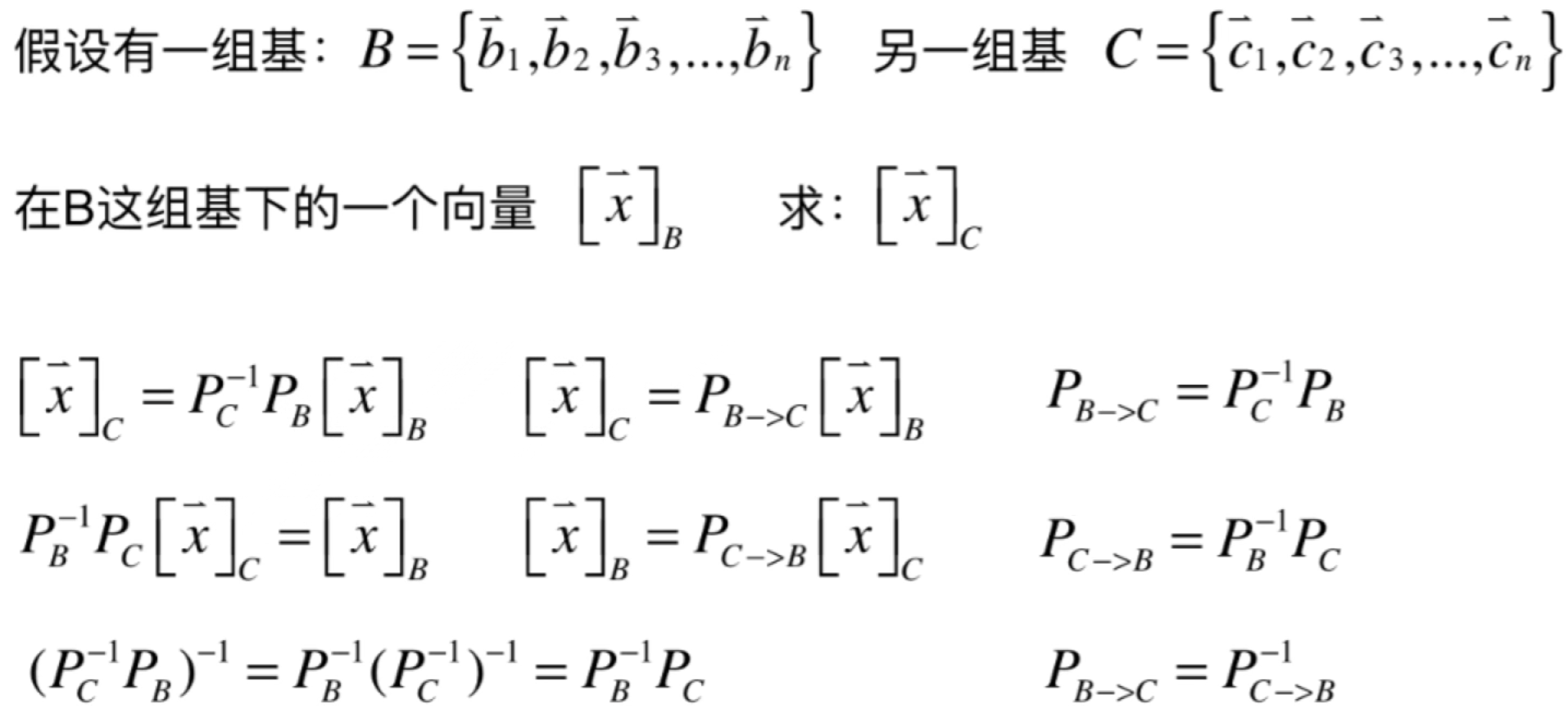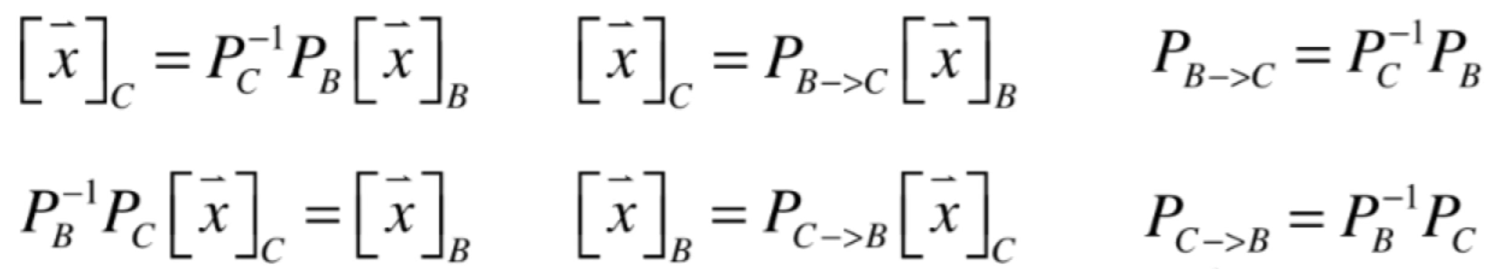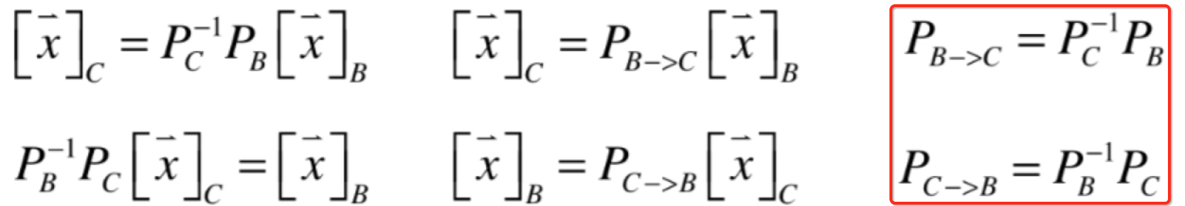 那为啥Pb这个矩阵是一定可逆的呢?因为它首先是一个方阵,另外它里面列向量一定是线性无关的,也是生成空间的,就可以根据方阵的那N多命题中推出它一定是可逆的,这里具体就不看了,因此,对于坐标转换相互的式子总结就是: