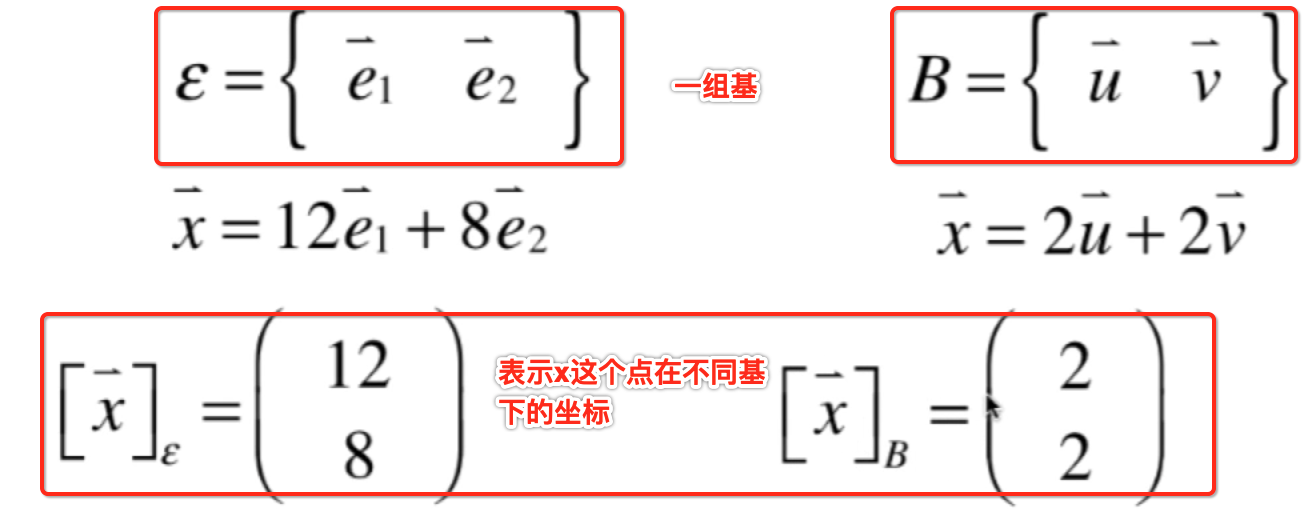 在n维空间,如果给定一组基,任何一个向量(或者是点)都可以表示成这组基的线性组合,且表示方法唯一!