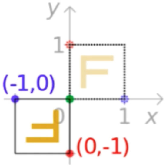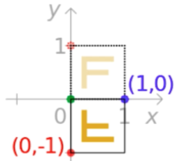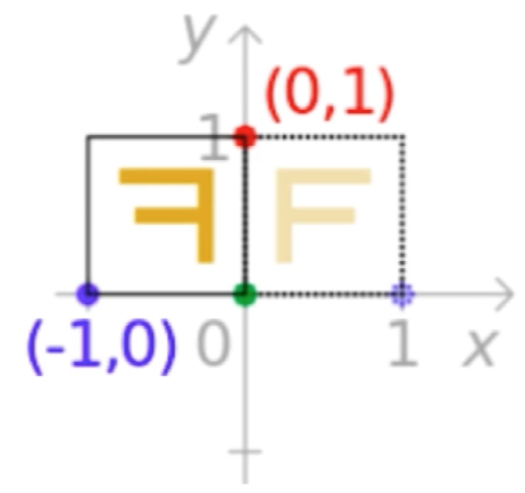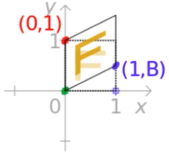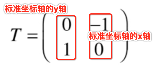 也就是要想让正F向左倒的效果,它对应的变换矩阵就可以从空间的基或坐标系的视角来想这个问题,其实深色的F的x轴就是原来坐标系的y轴,而它的y轴就是原来坐标系的x反向方,所以把这两个坐标轴按列排列起来就形成了一个坐标转换矩阵就为: