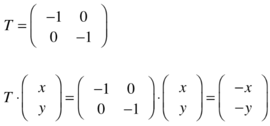 这样对于T中的(-1,0)、(0,1)这样坐标系的x,y就成为了所看到的(-x,y)。这样的视角可以再来看一下变换:让每个点关于原点翻转(x轴,y轴均翻转)