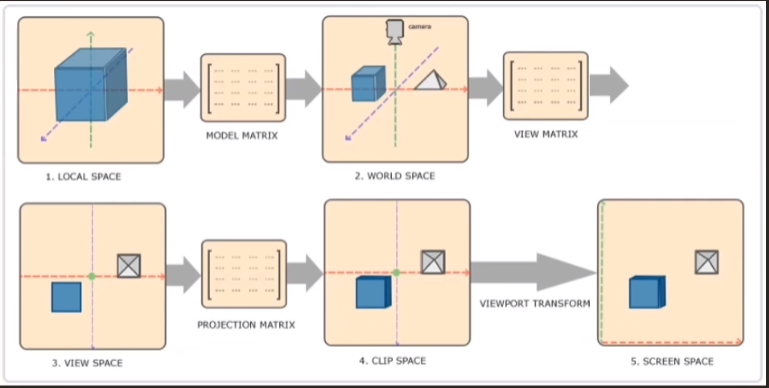MVP矩阵分别是模型(Model)、观察(View)、投影(Projection) 三个矩阵。我们的顶点坐标起始于局部空间(Local Space),在这里它称为局部坐标(Local Coordinate),它在之后会变为世界坐标(World Coordinate),观察坐标(View Coordinate),裁剪坐标(Clip Coordinate),并最后以屏幕坐标(Screen Coordinate)的形式结束。