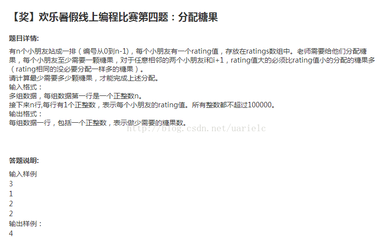 * 思路:分治法。每一趟使相邻两个或三个小朋友满足rating值大于相邻rating值时糖果值大于相邻糖果值,直到最后一趟比较所有小朋友的糖果值都没有被修改(递归)。