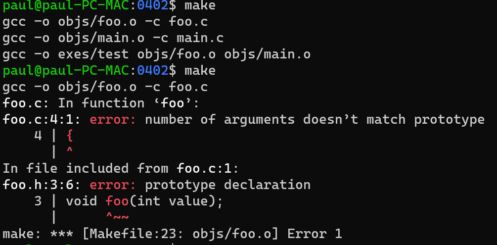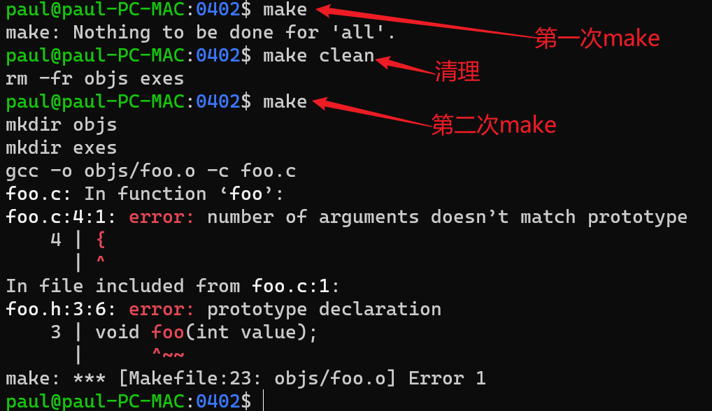 并不对 foo.c进⾏相应的更改。这样⼀改的话,由于声名与定义不相同,所以理论上编译时应当出错。【先不要进行make clean,直接进行make,否则可能出现的结果和我们预期的不一致】