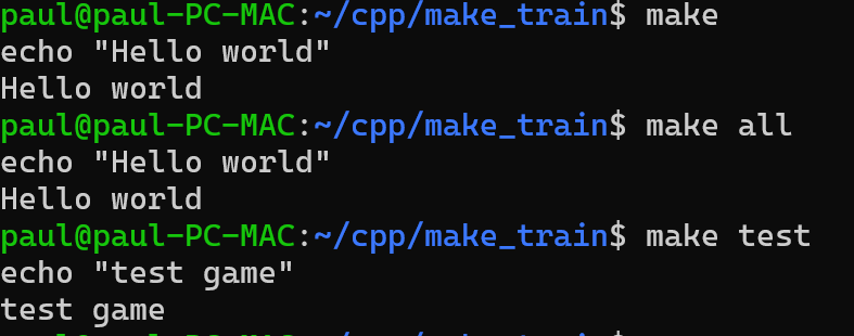 由此可见,⼀个 Makefile 中可以定义多个⽬标。调⽤ make 命令时,我们得告诉它我们的⽬标是什么,即要它⼲什么。当没有指明具体的⽬标是什么 时,那么 make 以 Makefile ⽂件中定义的第⼀个⽬标作为这次运⾏的⽬标。这“第⼀个”⽬标也称之 为默认⽬标(和是不是all没有关系)。当 make 得到⽬标后,先找到定义⽬标的规则,然后运⾏规则中的命令来达到构建⽬标的⽬的。