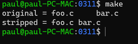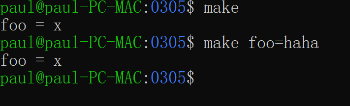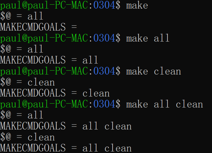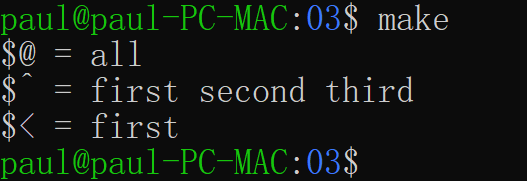 - $@⽤于表示⼀个规则中的⽬标。当我们的⼀个规则中有多个⽬标时,$@所指的是其中任何造成命令被运⾏的⽬标。