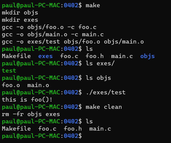 最⼤的变化除了增加了对于 addprefix 函数的运⽤为每⼀个⽬标⽂件加上“objs/”前缀外,还有⼀个很⼤的变化是,我们需要在构建⽬标⽂件的模式规则中的⽬标前也加上“objs/”前缀,即增加“$(DIR_OBJS)/”前缀。之所以要加上,是因为规则的命令中的-o 选项需要以它作为⽬标⽂件的最终⽣成位置,还有就是因为 OBJS 也加上了前缀,⽽要使得 Makefile 中的⽬标创建规则被运⽤,也需要采⽤相类似的格式,即前⾯有“objs/”。此外,由于改动后的 Makefile 会将所有的⽬标⽂件放⼊ objs ⽬录当中,⽽我们的 clean 规则中的命令包含将 objs ⽬录删除的操作,所以我们可以去除命令中对 OBJS 中⽂件的删除。这导致的改动就是 Makefile 中的最后⼀⾏中删除了$(OBJS)。同样的方法将 test 放入到 exes 文件夹中。