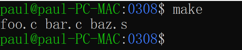 如上面的makefile,all ⽬标后⾯的 test 是告诉 make,all ⽬标依赖 test ⽬标,这⼀依赖⽬标在 Makefile 中⼜被称之为先决条件。出现这种⽬标依赖关系时,make⼯具会按 从左到右的先后顺序先构建规则中所依赖的每⼀个⽬标。如果希望构建 all ⽬标,那么make 会在构建它之 前得先构建 test ⽬标,这就是为什么我们称之为先决条件的原因。