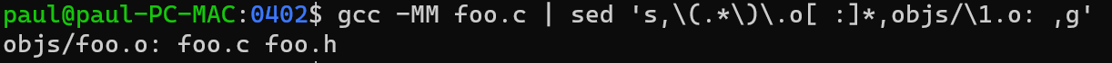 sed 's,(.*).o[ :]*,objs/1.o: ,g' < $@.tmp > $@ ;