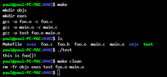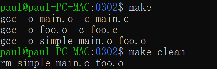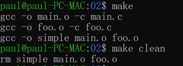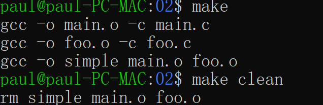 在上面的指令中,多了很多的echo "......"的内容,这部分不是我们所期望的,如果要去掉,需要对上面的makefile进行一个改动,也就是在命令前加上一个@,这个符号就是告诉make,在运行的时候这一行命令不显示出来。