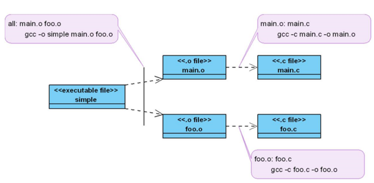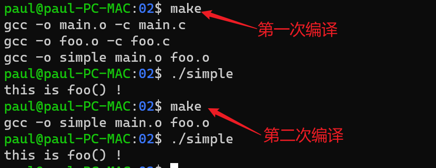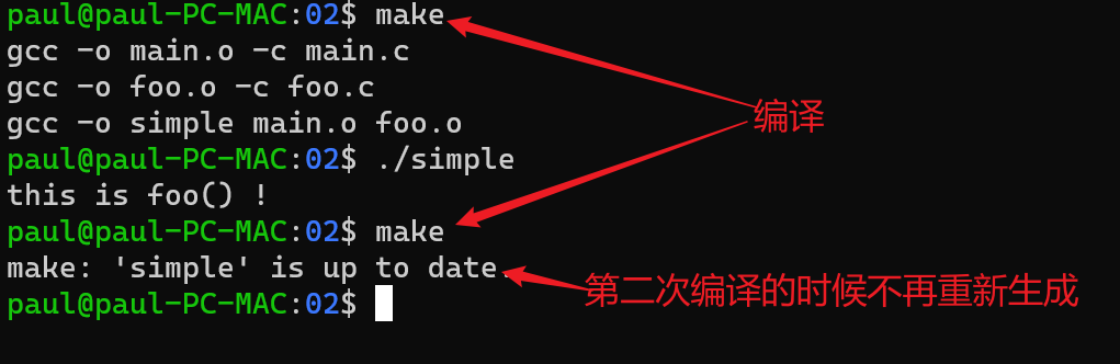上面的展示了测试结果,注意到了第⼆次编译并没有构建⽬标⽂件的动作吗?但为什么有构建simple可执⾏程序的动作呢?为了明⽩为什么,我们需要了解 make 是如何决定哪些⽬标(这⾥是⽂件)是需要重新编译的。为什么 make会知道我们并没有改变 main.c 和 foo.c 呢?答案很简单,通过⽂件的时间戳!当 make 在运⾏⼀个规则时,我们前⾯已经提到 了⽬标和先决条件之间的依赖关系,make 在检查⼀个规则时,采⽤的⽅法是:如果先决条件中相关的⽂件的时间戳⼤于⽬标的时间戳,即先决条件中的⽂件⽐⽬标更新,则知道有变化,那么需要运⾏规则当中 的命令重新构建⽬标。这条规则会运⽤到所有与我们在 make时指定的⽬标的依赖树中的每⼀个规则。⽐如,对于 simple 项⽬,其依赖树中包括三个规则,make 会检查所有三个规则当中的⽬标(⽂件)与先决条件(⽂件)之间的时间先后关系,从⽽来决定是否要重新创建规则中的⽬标。