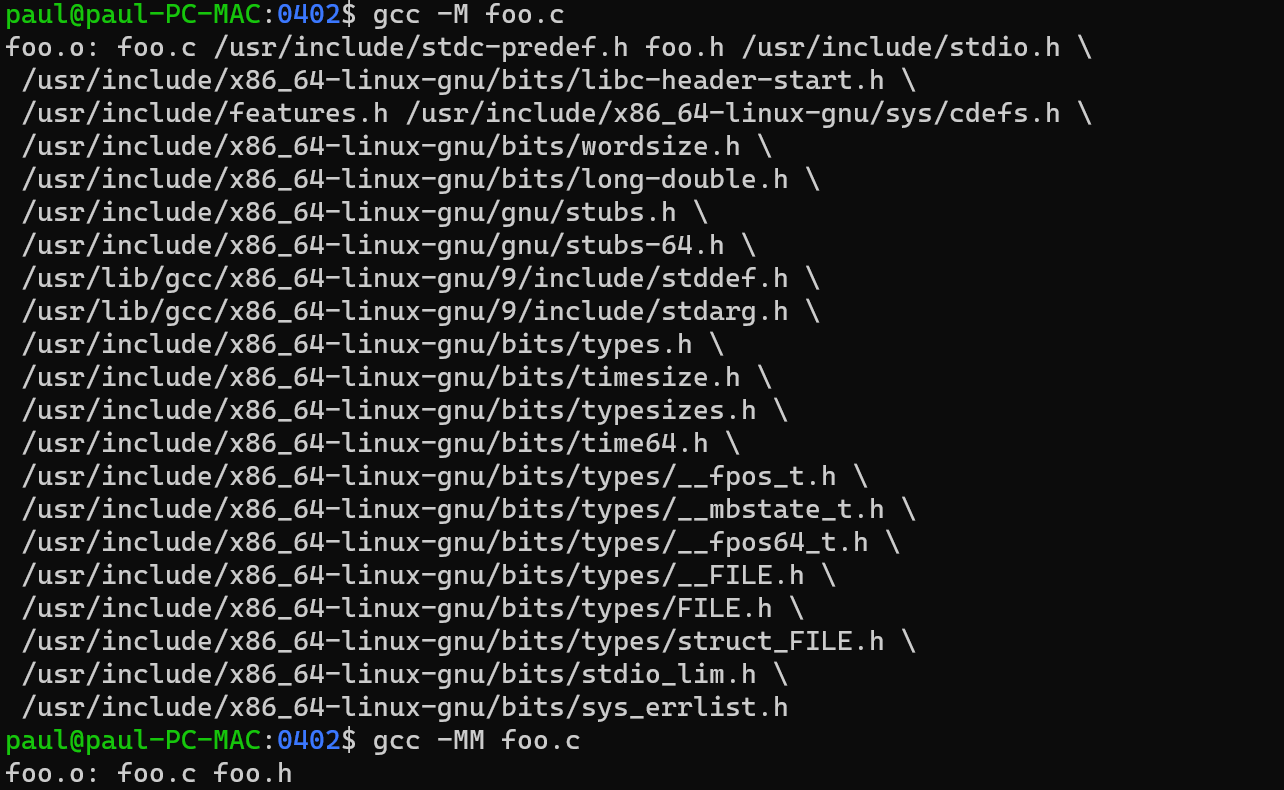 时,动态的⽣成⽂件的依赖关系。还真是存在这么⼀个⼯具!就是我们的编译器 ——gcc。下图列出了采⽤ gcc 的-M 选项和-MM 选项列出 foo.c 对其它⽂件的依赖关系的结果,从结果你可以看出它们会列出 foo.c 中直接或是间接包含的头⽂件。-MM 选项与-M 选项的区别是,-MM选项并不列出对于系统头⽂件的依赖关系,⽐如 stdio.h 就属于系统头⽂件。其道理是,绝⼤多数情况我们并不会改变系统的头⽂件,⽽只会对⾃⼰项⽬的头⽂件进⾏更改。
