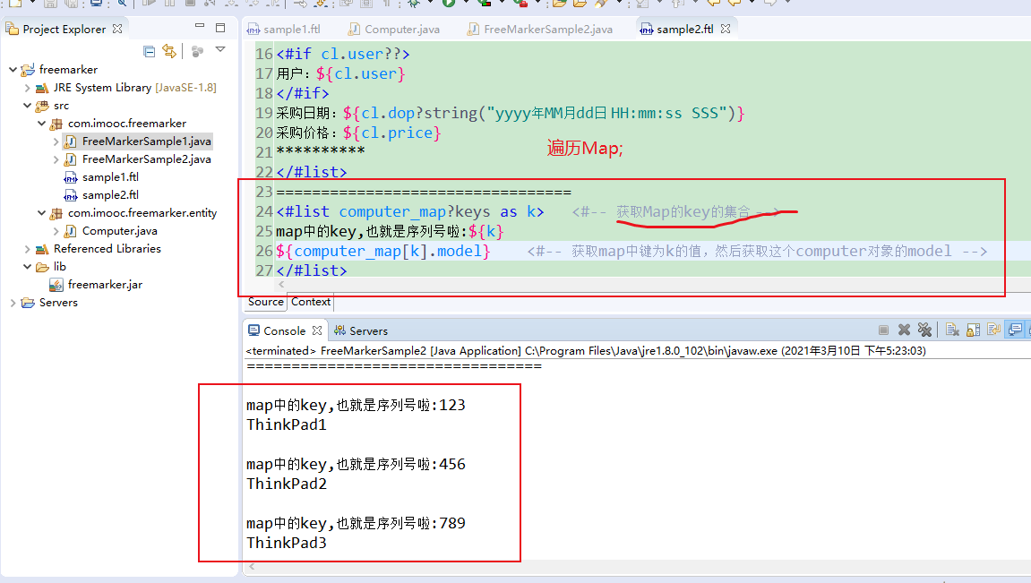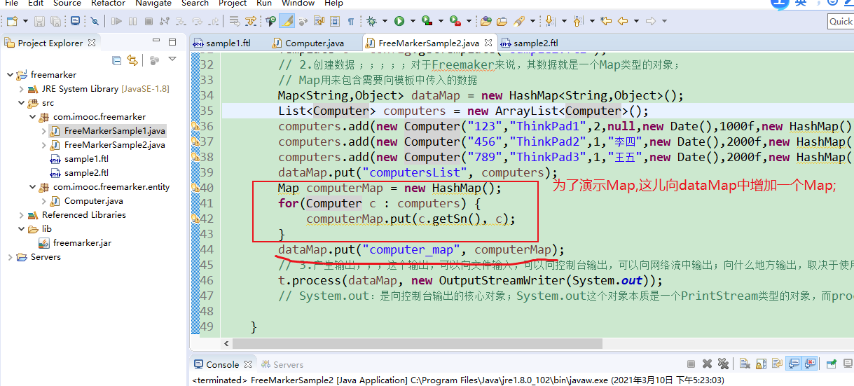 为了演示Map:在FreeMarkerSample2中,给dataMap添加一个Map集合,computer_map;