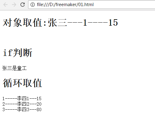 @Test public void test00(){ List<Employee>ems=Arrays.asList( new Employee(1, "李四1", 15), new Employee(2, "李四2", 20), new Employee(3, "李四3", 80)); Employee employee=new Employee(1, "张三", 15); root.put("emp", employee); root.put("emps", ems); freemakerUtil.fprint(root, "01.ftl", fn+"01.html"); }