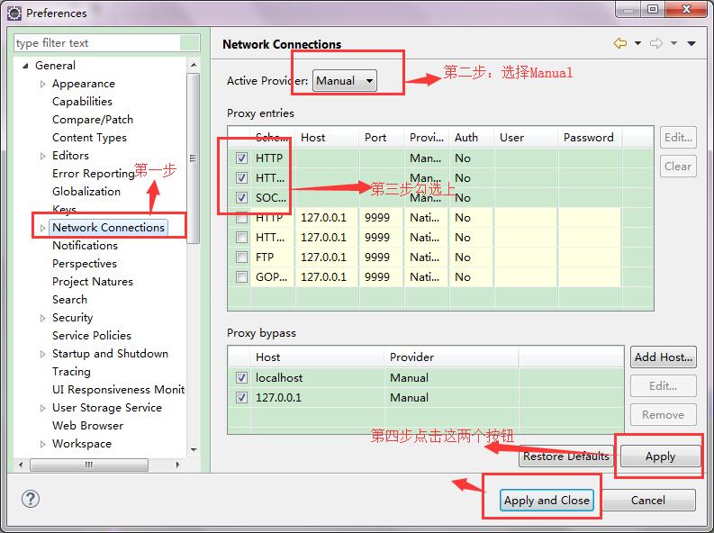 window->preferences->general->network connection,右边的active provider选择manual,勾上HTTP、HTTPS、SOCKS,apply一下,重启eclipse就可以解决这个问题了。如下图: