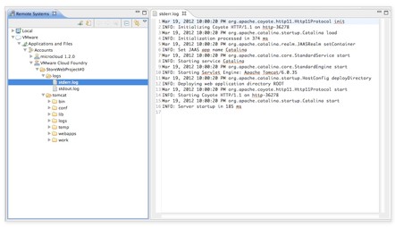 Cloud FoundryIntegration扩展提供了一个文件浏览器,可以用于查看部署到Cloud Foundry的文件。例如,可以在远程Cloud Foundry服务器上查看配置文件和日志文件。