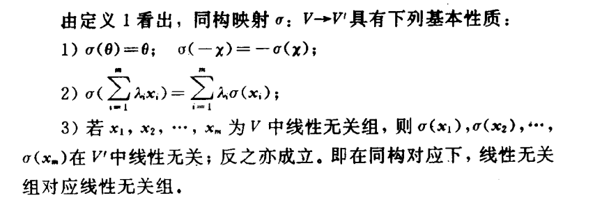 简单的理解:V1和V2称之为是同构的,如果这两者之间能建立起元素(向量)的一一对应关系,并且这个对应能够保持在V1中的加法和数乘运算。