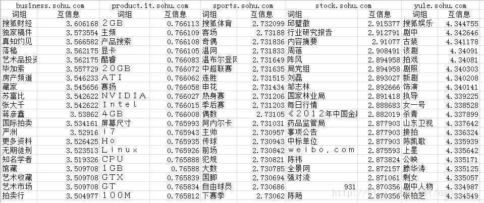 通过上表可以明显看出,仅仅用互信息来选词并不是那么理想,为什么呢?仔细分析可以发现,低词频对于互信息的影响还是蛮大的,一个词如果频次不够多,但是又主要出现在某个类别里,那么就会出现较高的互信息,从而给筛选带来噪音。所以为了避免出现这种情况可以采用先对词按照词频排序取然后按照互信息大小进行排序,然后再选择自己想要的词,这样就能比较好的解决找个问题。如下: