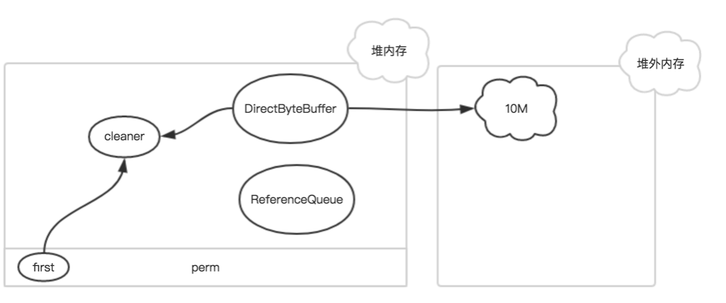 当一个 DirectByteBuffer初始化的时候,都会创建cleaner对象( 继承PhantomReference)并把 其注册进ReferenceQueue中。