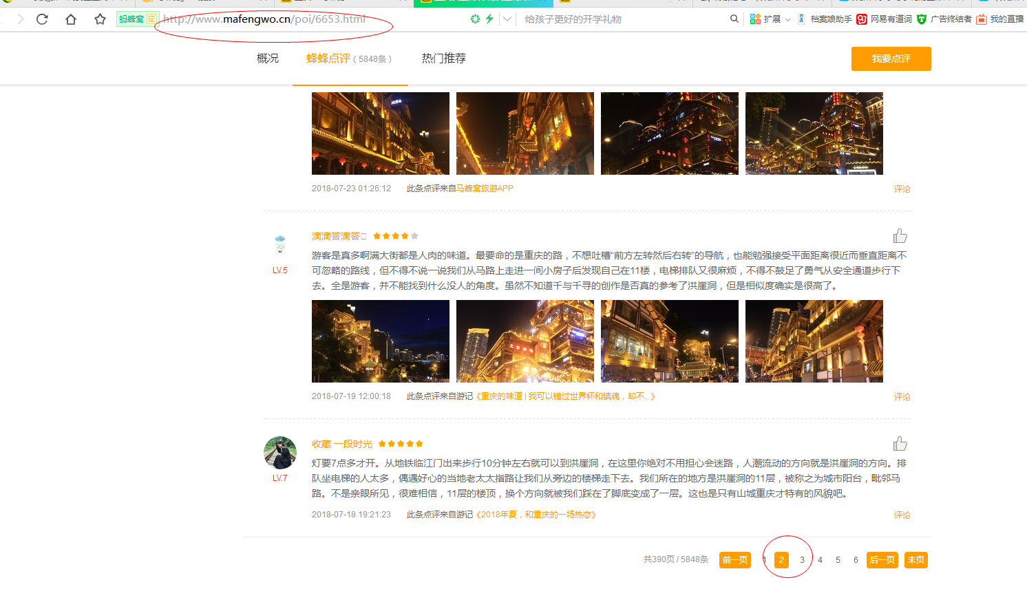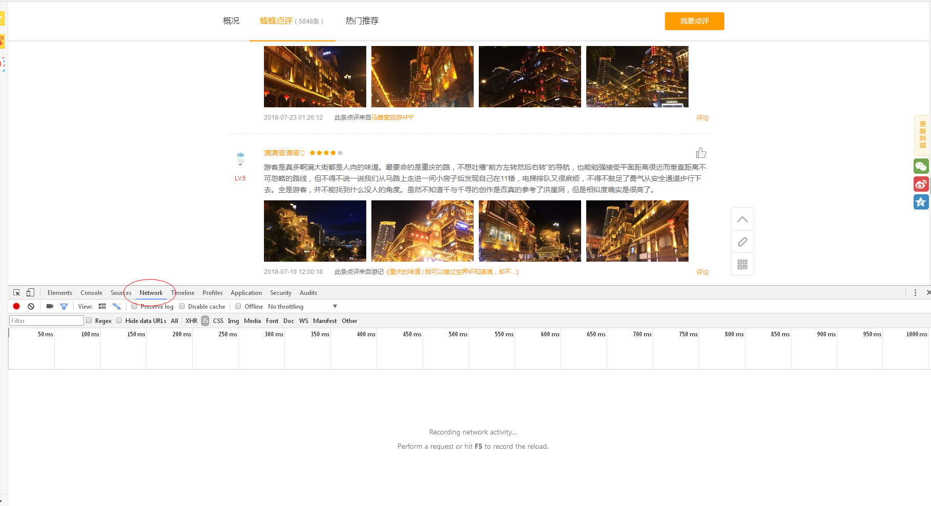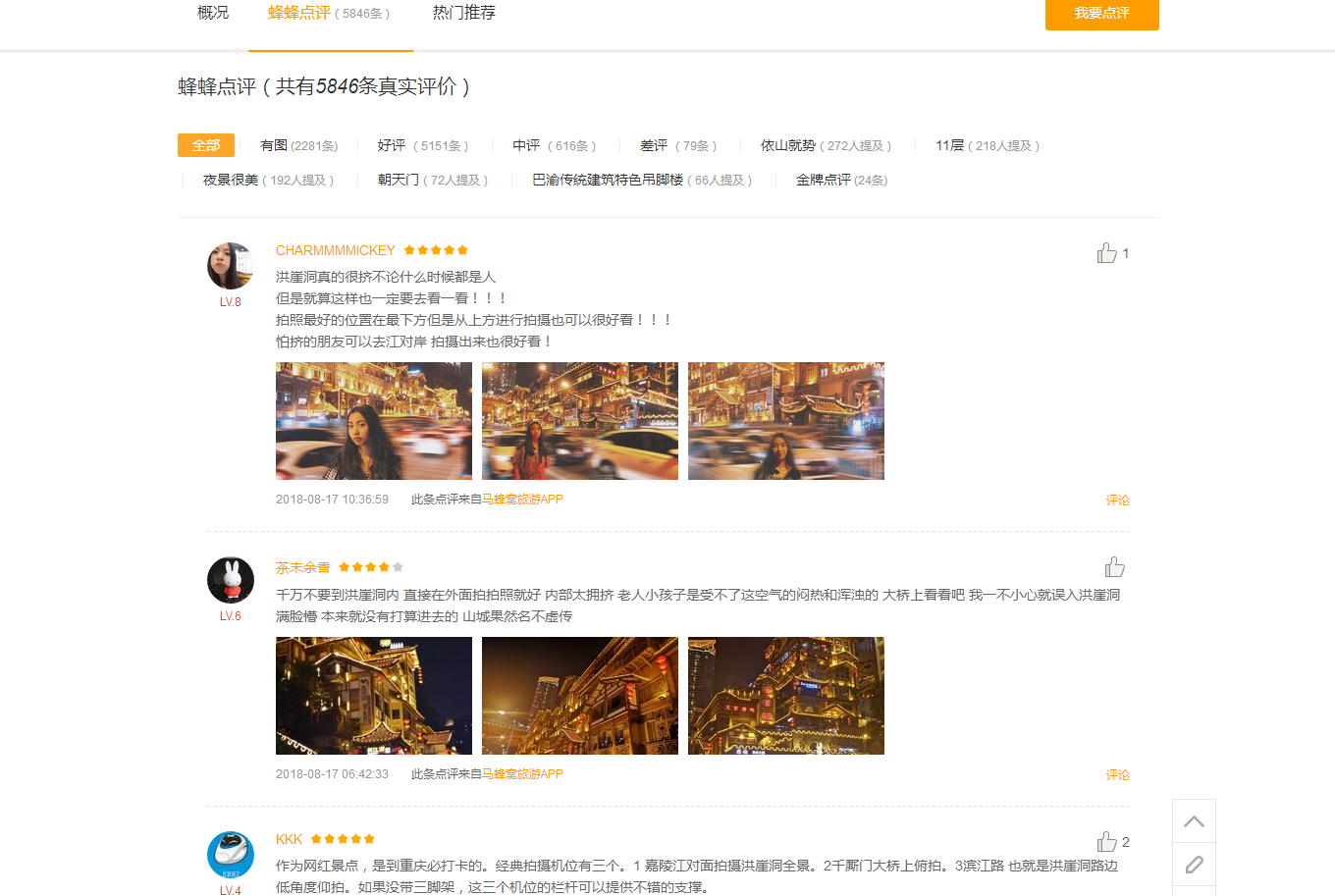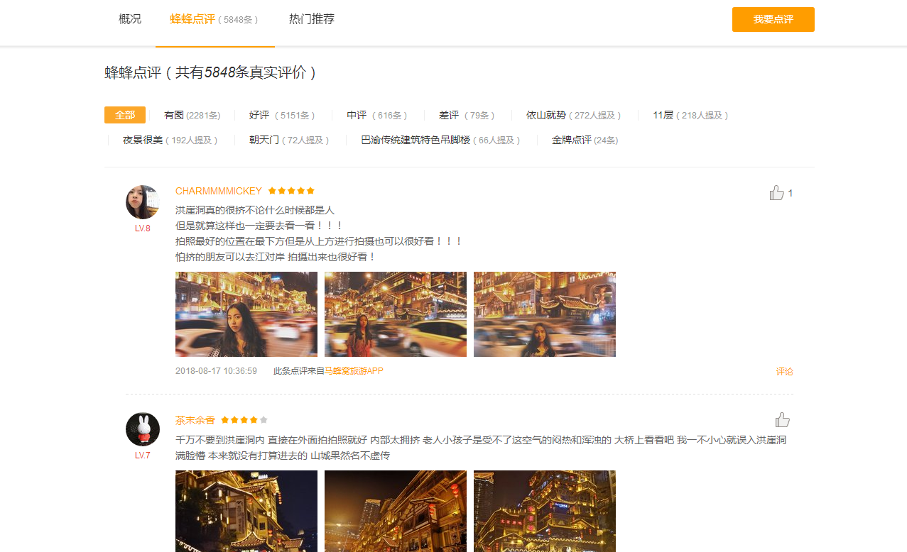 以洪崖洞页面为例,点击页面内的蜂蜂点评进入评论内容区域: