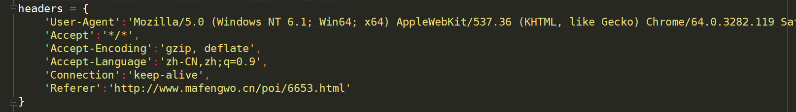 要伪装浏览器,我们需要将上图中的Request Headers下除了cookies的内容复制下来,整理成一个叫做headers的字典如下(其中起关键作用的是User-Agent,其他的可以不记录):