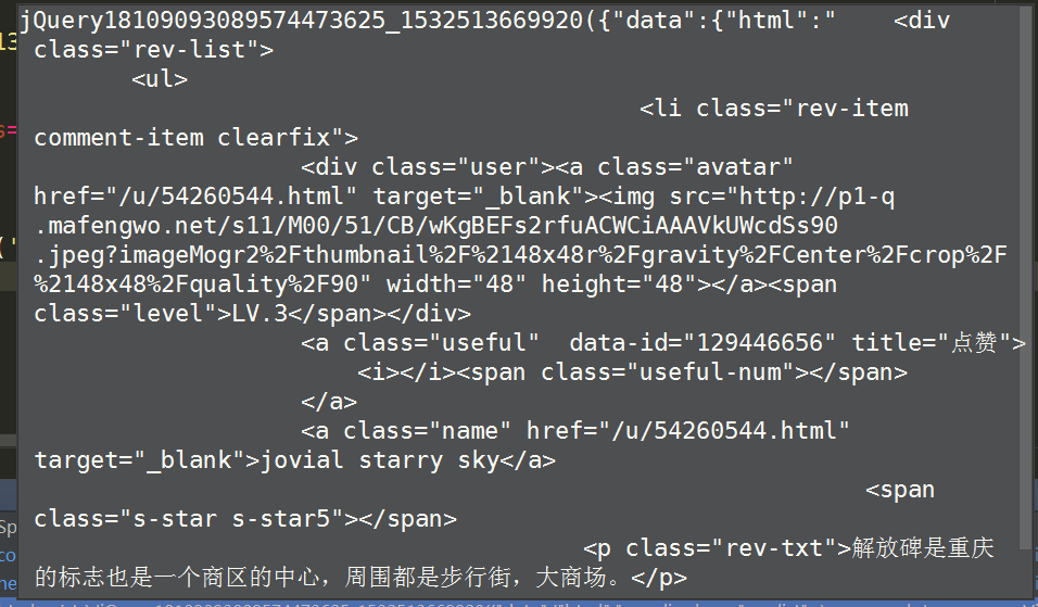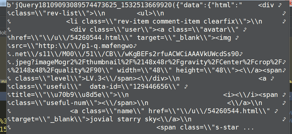 import requests #设置请求头文件 headers = { 'User-Agent':'Mozilla/5.0 (Windows NT 6.1; Win64; x64) AppleWebKit/537.36 (KHTML, like Gecko) Chrome/64.0.3282.119 Safari/537.36', 'Accept':'*/*', 'Accept-Encoding':'gzip, deflate', 'Accept-Language':'zh-CN,zh;q=0.9', 'Connection':'keep-alive', 'Referer':'http://www.mafengwo.cn/poi/6653.html' } #设置cookies cookie = { 'PHPSESSID':'1nivct21bumab1adia6i7k1a82', 'mfw_uuid':'5b583768-bf26-19ea-0187-96a00686bd4d', 'uva':'s%3A78%3A%22a%3A3%3A%7Bs%3A2%3A%22lt%22%3Bi%3A1532508009%3Bs%3A10%3A%22last_refer%22%3Bs%3A6%3A%22direct%22%3Bs%3A5%3A%22rhost%22%3Bs%3A0%3A%22%22%3B%7D%22%3B', '__mfwurd':'a%3A3%3A%7Bs%3A6%3A%22f_time%22%3Bi%3A1532508009%3Bs%3A9%3A%22f_rdomain%22%3Bs%3A0%3A%22%22%3Bs%3A6%3A%22f_host%22%3Bs%3A3%3A%22www%22%3B%7D', '__mfwuuid':'5b583768-bf26-19ea-0187-96a00686bd4d', 'UM_distinctid':'164d0987902bb2-0bb3f4e59cf01f-3e3d560e-1fa400-164d098790328c', 'oad_n':'a%3A3%3A%7Bs%3A3%3A%22oid%22%3Bi%3A1029%3Bs%3A2%3A%22dm%22%3Bs%3A15%3A%22www.mafengwo.cn%22%3Bs%3A2%3A%22ft%22%3Bs%3A19%3A%222018-07-25+16%3A40%3A08%22%3B%7D', '__mfwlv':'1532508009', '__mfwvn':'1', '__mfwlt':'1532508103' } url_left = 'http://pagelet.mafengwo.cn/poi/pagelet/poiCommentListApi?callback=jQuery18109093089574473625_1532513669920¶ms=%7B%22poi_id%22%3A%22' url_middle = '%22%2C%22page%22%3A' url_right = '%2C%22just_comment%22%3A1%7D&_=1532513718986' url = url_left+'1690'+url_middle+'13'+url_right r = requests.get(url=url, headers=headers, cookies=cookie)