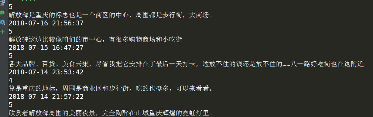 可以看到,需要的中文内容已经提取完毕,接下来我们需要做的是对我们感兴趣的内容进行提取,,这里我们感兴趣的是每条评论的文本内容、评分以及评论时间,这里使用正则表达式来提取: