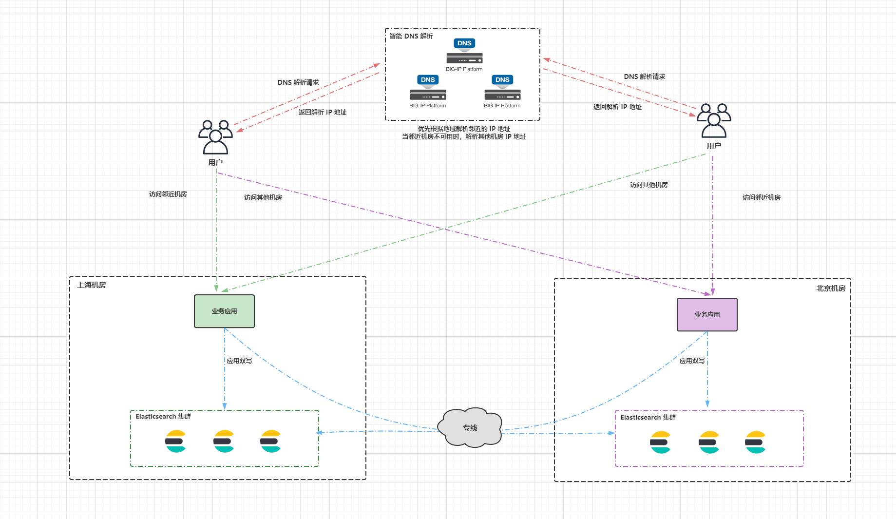 下图是双机房部署的一个整体架构图,在两个机房以双活的形式各部署一套 Elasticsearch 集群,同时对外提供服务,两个 Elasticsearch 集群配置 CCR 双向复制。机房之间的网络通过专线打通,用于承载 CCR 跨集群复制以及业务应用跨机房访问 Elasticsearch 集群的流量。业务应用的读写请求优先访问本机房的 Elasticsearch 集群,当本机房的集群出现不可用时,访问备机房的 Elasticsearch 集群。在公网部署一套智能 DNS 服务,根据用户的 IP 地址将域名解析到邻近用户机房的公网 IP,当整个机房出现故障时,才将域名解析到备机房的公网 IP。