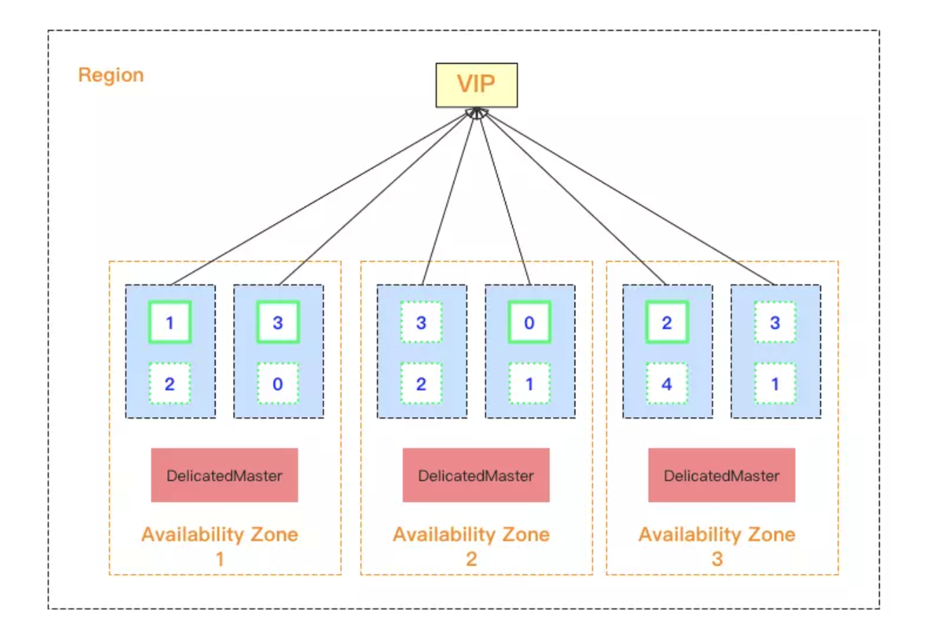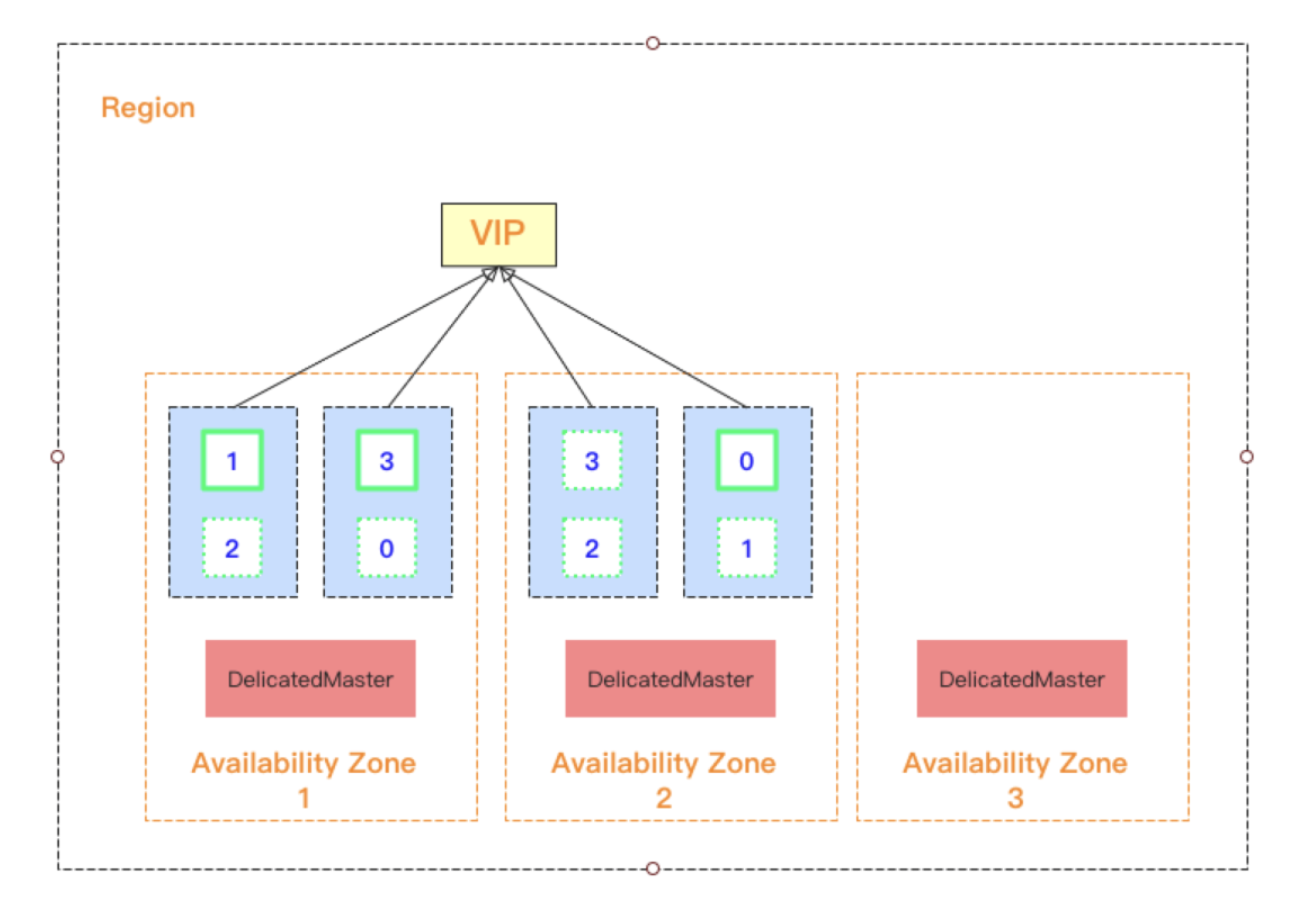 - 当选择双可用区部署时,为了避免出现一个可用区上分布两个专用主节点且出现“该可用区不可用”导致选不出 Master 节点的情况,腾讯云 ES 会选择一个隐藏可用区用来专门部署专用主节点。