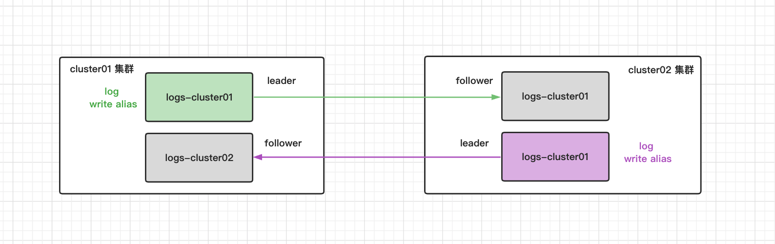 针对上述问题,这里也提供了一种解决方案,那就是双向复制(CCR bi-directional replication)。如下图所示,我们可以在集群 cluster01 上创建索引 logs-cluster01,并在集群 cluster02 上复制该索引;在集群 cluster02 上创建索引 logs-cluster02 ,并在集群 cluster01 上复制该索引。然后在两个集群上创建别名 logs 指向索引 logs-cluster01 和 logs-cluster02,对外可以提供统一的索引名。别名指向的多个索引中,只能有一个索引是允许接收写入请求的,在 cluster01 将索引 logs-cluster01 设置为可写,logs-cluster02 索引中的数据将会通过 CCR 跨集群复制从集群 cluster02 中获取;集群 cluster02 的别名设置相反。通过以上设置,应用程序在读写的时候都往 logs 别名发送请求,假设当集群 cluster01 不可用时,我们可以继续使用集群 cluster02,并且依然是往 logs 别名发送请求,无需手动进行切换操作;当集群 cluster01 恢复后,会从上次记录的 checkpoint 继续从集群 cluster02 复制数据,也无需额外的切换操作。