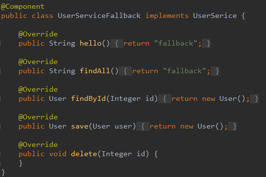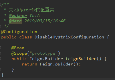 如果只想针对某个服务客户端关闭Hystrix支持时,需要通过使用@Scope("prototype")注解为指定的客户端配置Feign.Builder实例