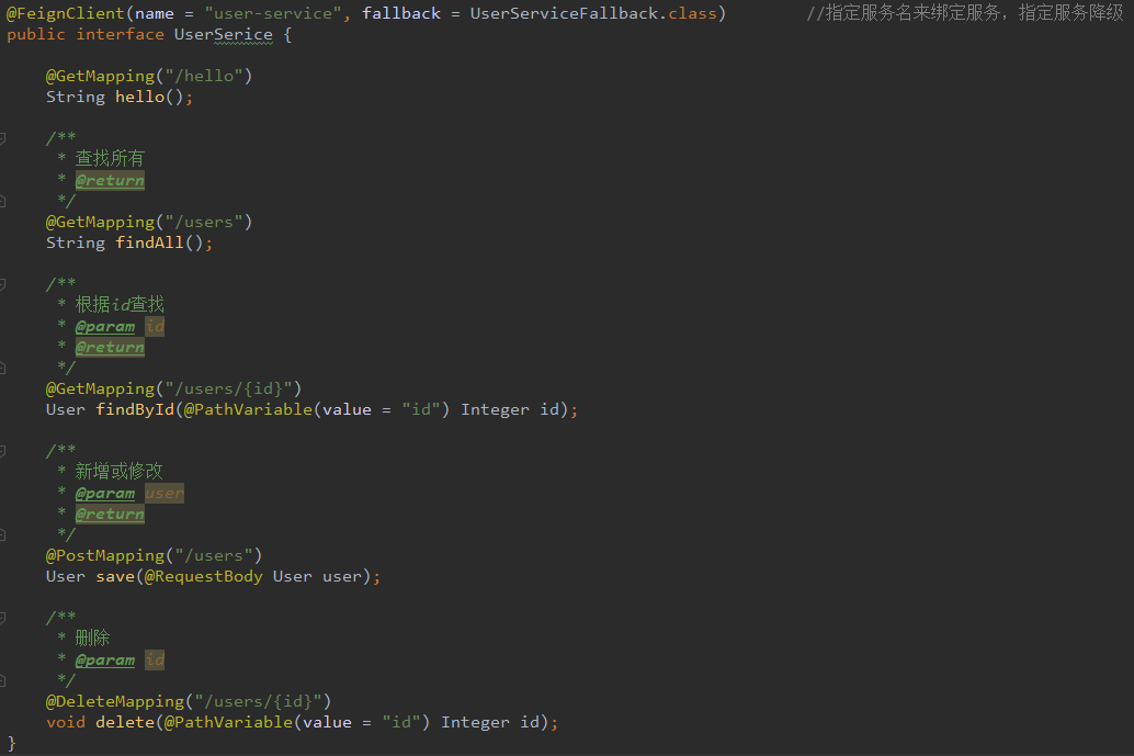 在Spring Cloud Feign的实现下,只需创建一个借口并用注解的方式来配置它,即可完成对服务提供方的接口绑定,简化了在使用Spring Cloud Ribbon时自行封装服务调用客户端的开发量。