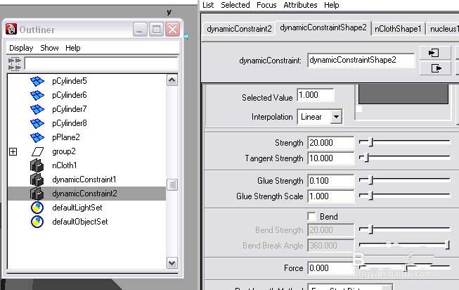 10、播放动画看下效果。现在编辑可撕裂的表面,打开outliner并选择dynamicConstraint2。然后打开属性编辑器。