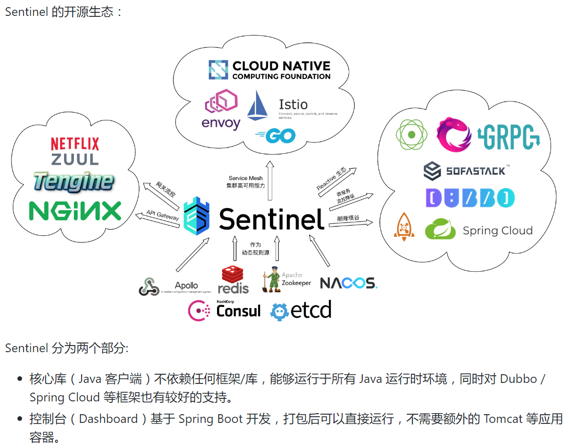 Sentinel:把流量作为切入点,从流量控制、熔断降级、系统负载保护等多个维度保护服务的稳定性。