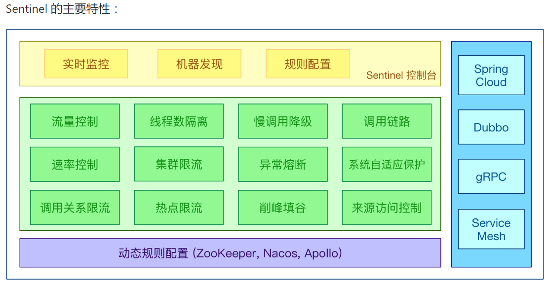 - 服务限流降级:默认支持 WebServlet、WebFlux, OpenFeign、RestTemplate、Spring Cloud Gateway, Zuul, Dubbo 和 RocketMQ 限流降级功能的接入,可以在运行时通过控制台实时修改限流降级规则,还支持查看限流降级 Metrics 监控。